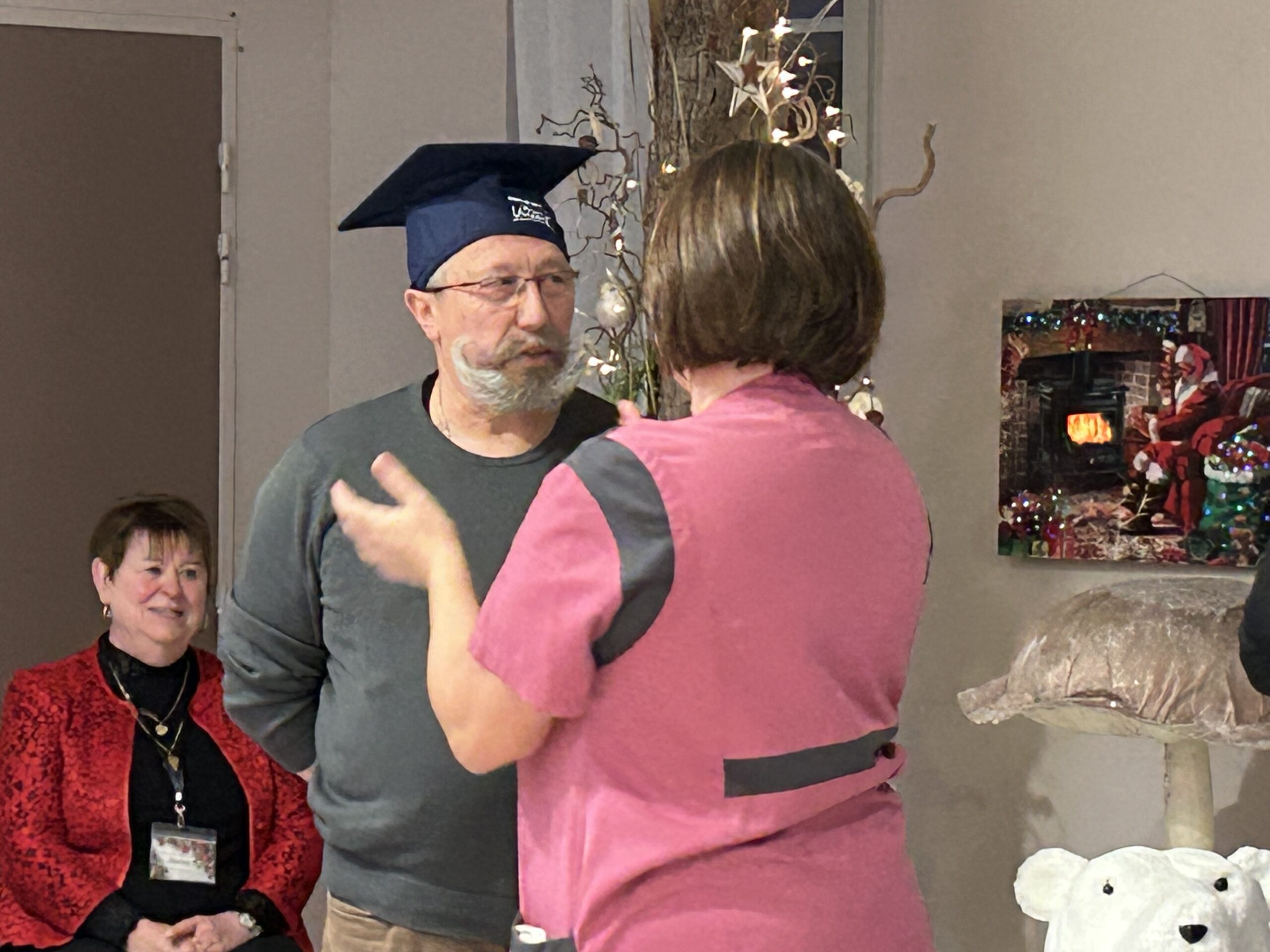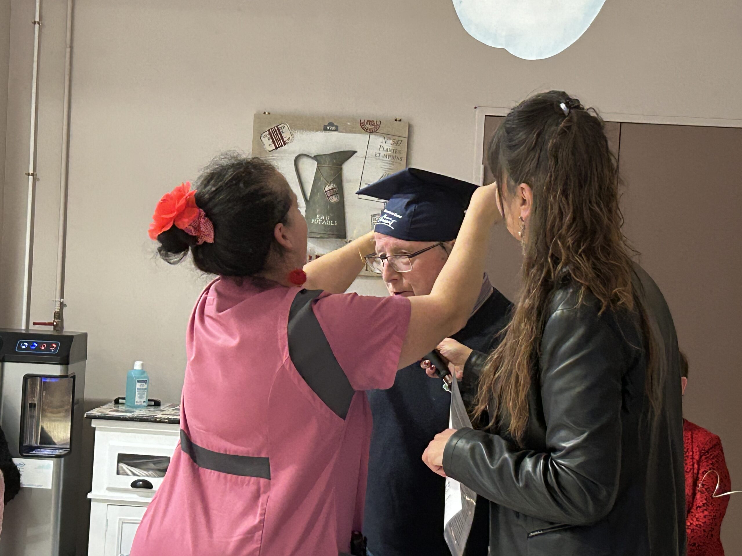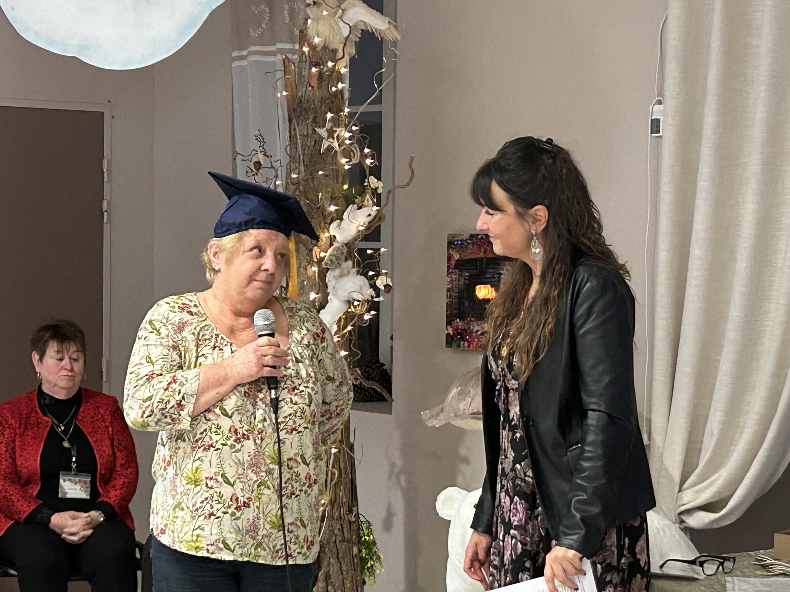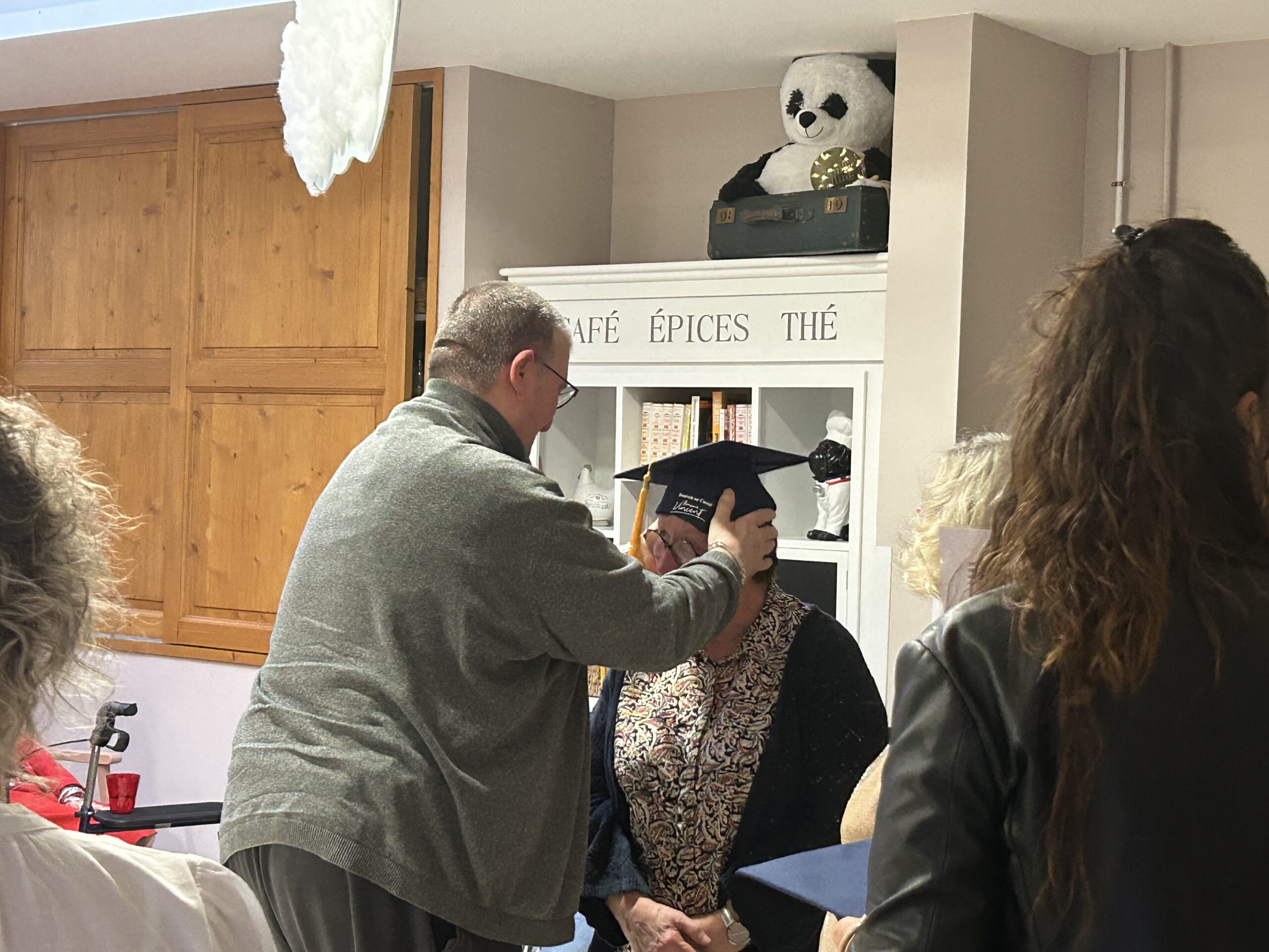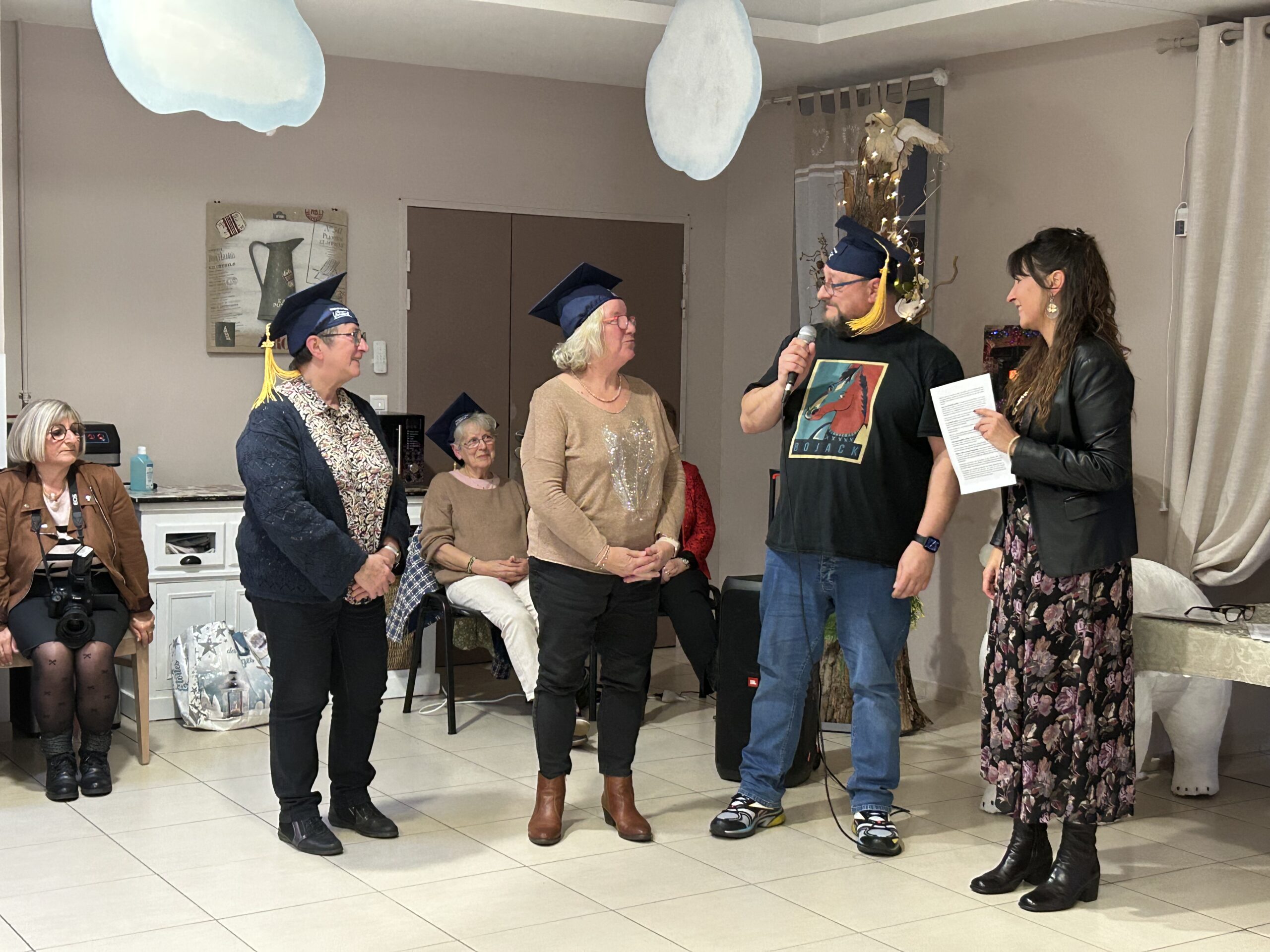 Chaque bénévole a eu droit à un mot personnalisé prononcé par Sabine Soyez, directrice de l’établissement, soulignant l’importance de leur rôle et la reconnaissance de toute l’équipe. Les médailles et coiffes ont été remises par les professionnels de la résidence… mais aussi par les résidents eux-mêmes, ajoutant une dimension humaine et émotive à ce moment fort.